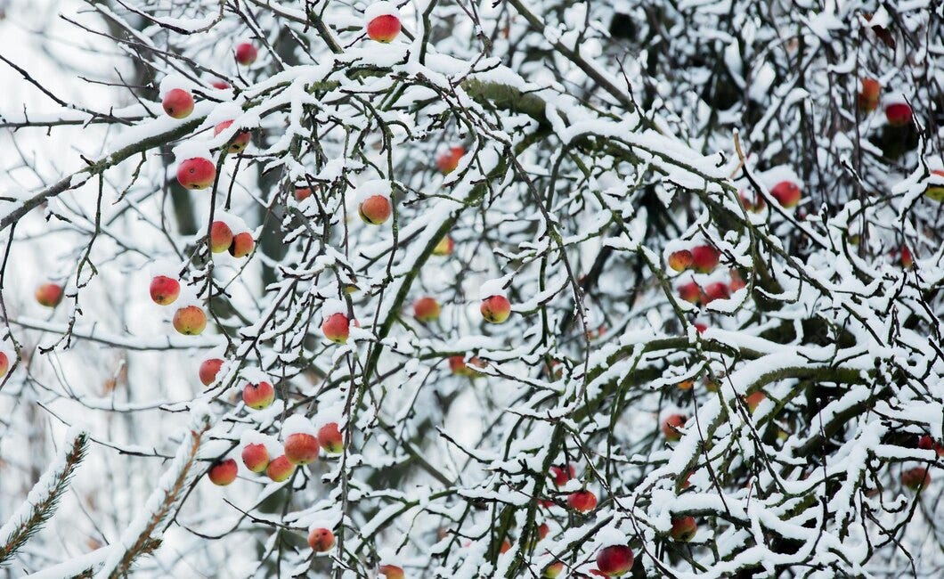 white snow settles on trees like years cling to our lives pale red apples shrivel on stems unpicked possibilities another winter comes to us still here among the living