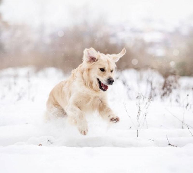 white bird falling with white snow dry branch clings to both a man throws his dog a snowball in the snow tail wagging nose not knowing where to go